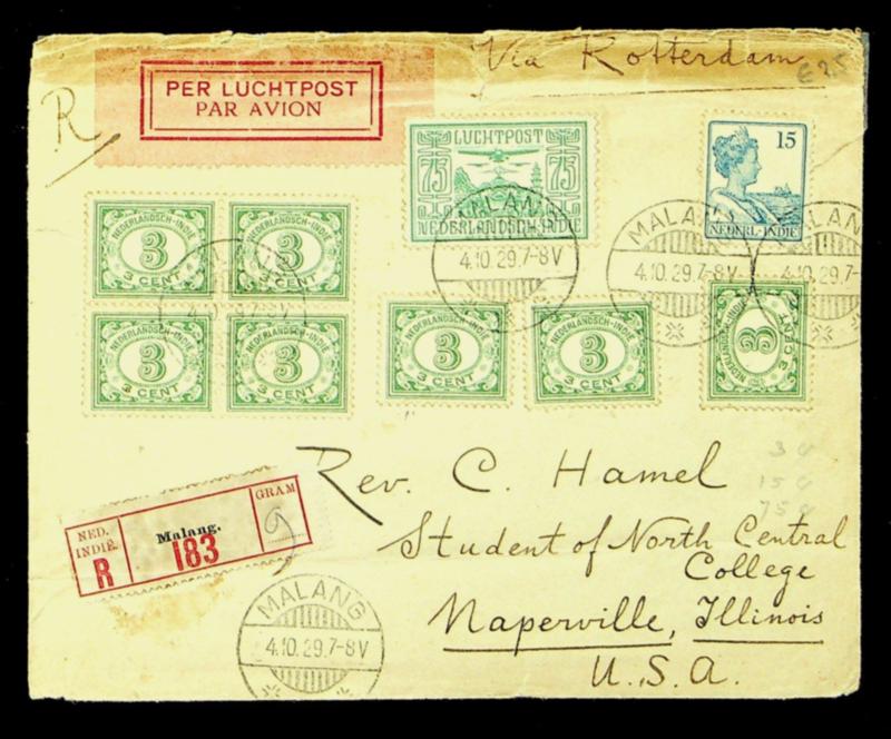 Netherlands Indies 1929 9v on Regd airmail cover from Malang via Rotterdam Netherlands to Naperville Illinois USA (Image)