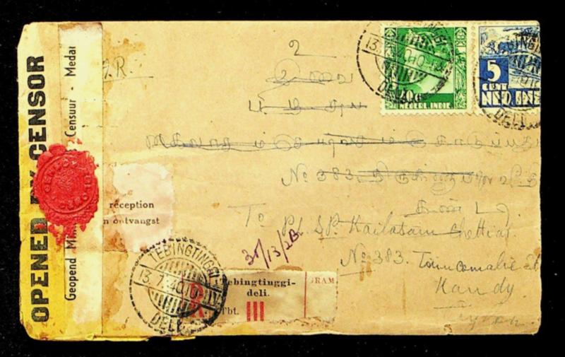 Netherlands Indies 1940 WWII 2v on censored Regd cover from Tebingtinggi-Deli to Kandy Ceylon (Image)