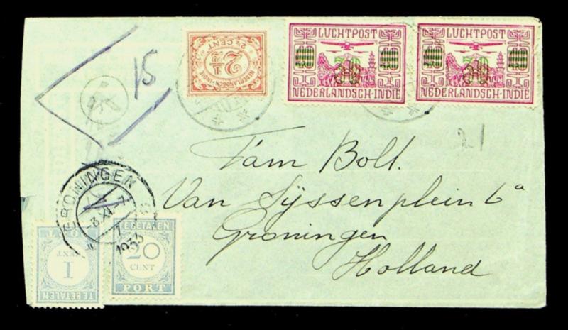 Netherlands Indies 1933 30cx2 s/c+ 2½c on airmail cover from Soerabaja to Groningen Netherlands w/ Postage Due 1c+ 20c (Image)