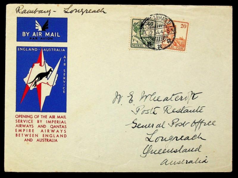Netherlands Indies 1934 2v on Imperial Airways & Qantas Airmail FFC from Laboean Hadji to Longreach Queensland Australia (Image)