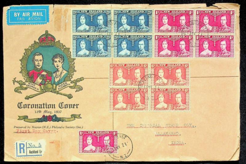 New Zealand 1937 QE & KGVI Coronation 3 blocks of 4+ 1d on Regd airmail from Auckland East to Allahabad India (Image)