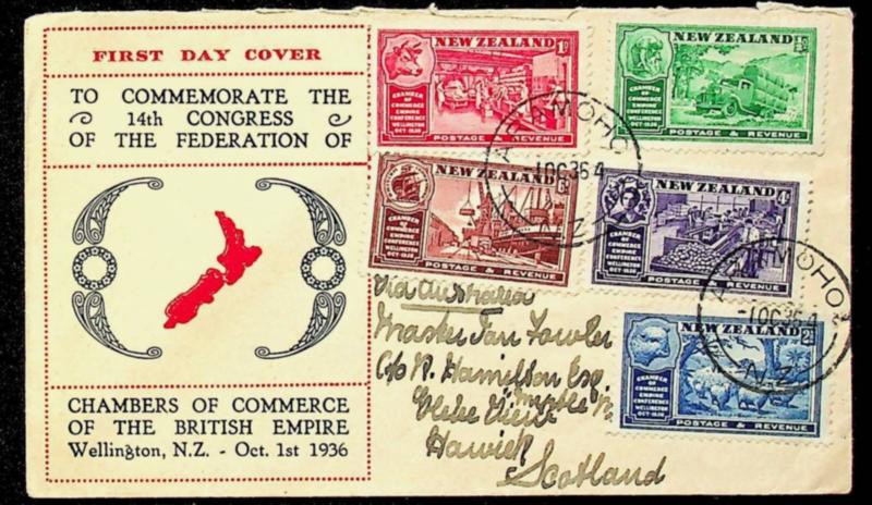 New Zealand 1954 Chamber of Commerce Empire Conference FDC w/ 5v from Aramoho to Scotland (Image)