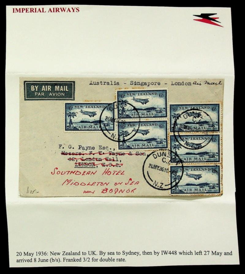 New Zealand 1936 6dx6 on Imperial Airways airmail Taxed cover via Australia/ Singapore & redirected to Southdean Hotel UK (Image)