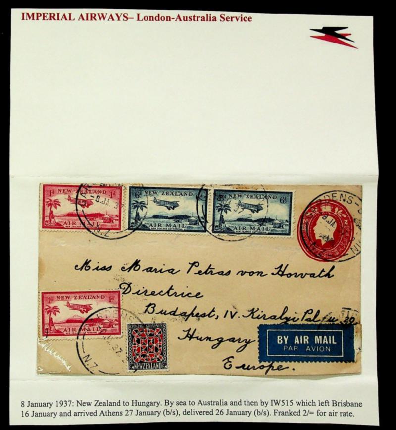 New Zealand 1937 uprated KGV Imperial Airways airmail envelope via Australia/ Athens Greece to Budapest Hungary (Image)