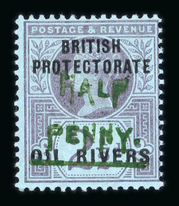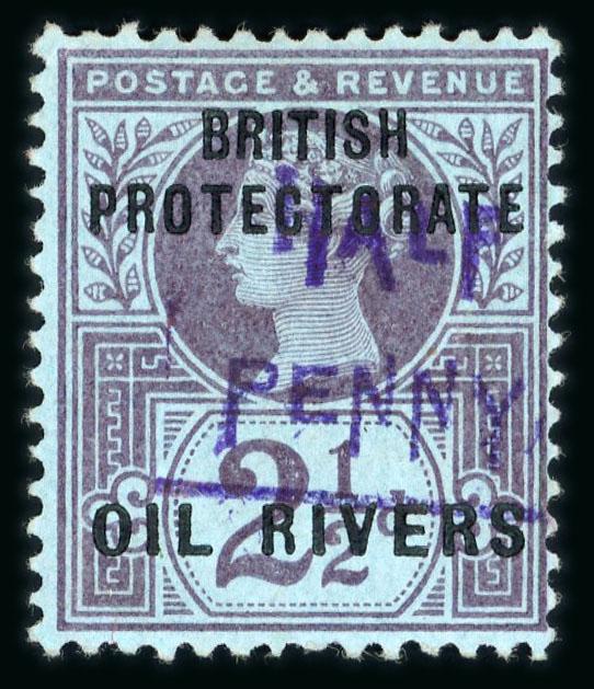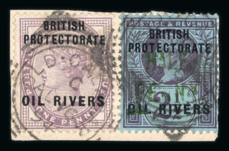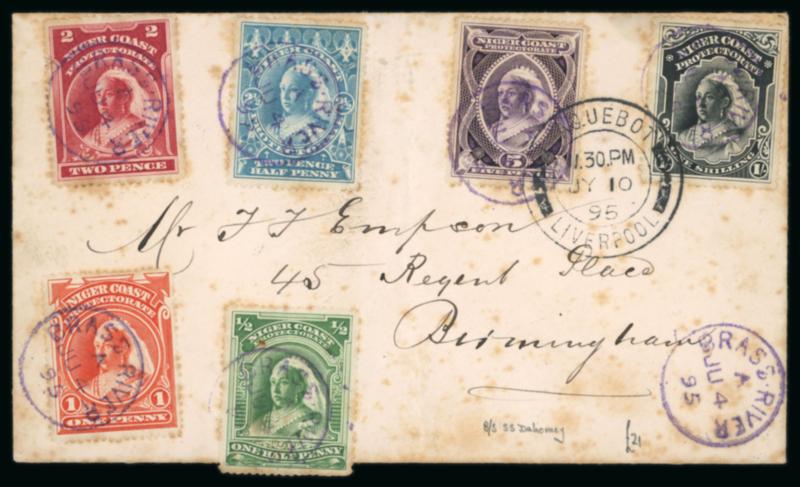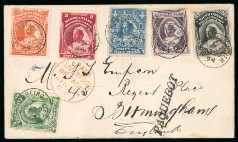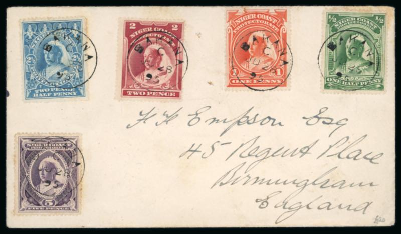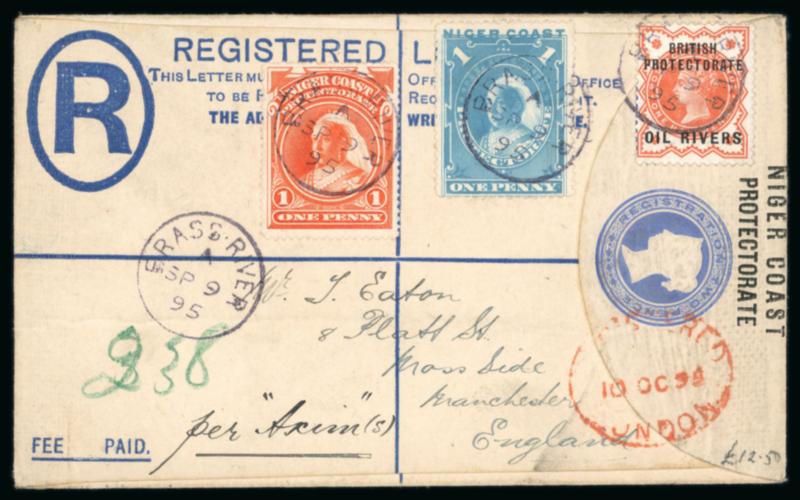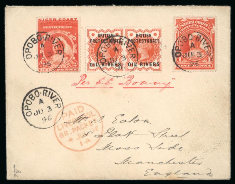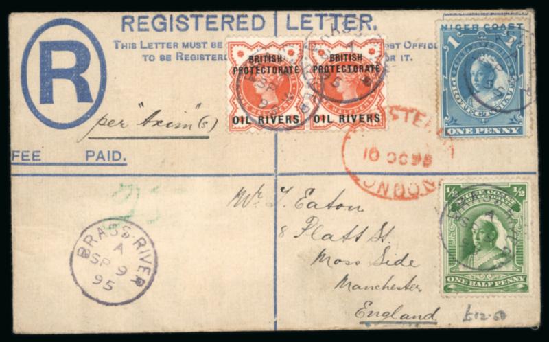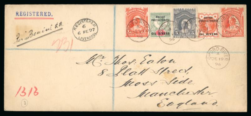 Opobo River: 1896 (Dec 19) envelope sent registered to England with 1892-94 1/2d and 2d and two 1894 1d and one 5d each tied by Opobo River code A cds, Liverpool transit and Manchester arrival, paying triple the 2 1/2d rate plus registration, endorsed "Per Benin SS", a very fine and attractive franking. (Image)