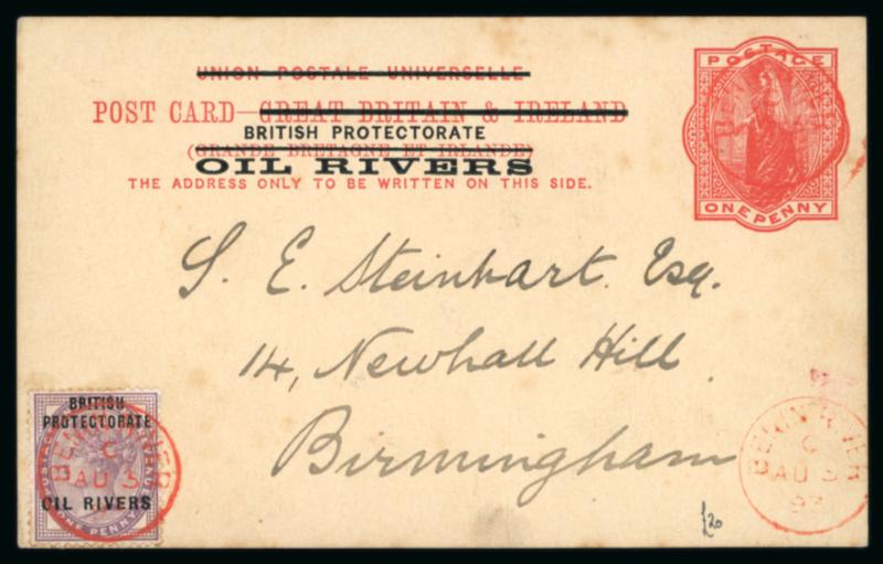 Benin River: 1893 (Aug 3) 1d postal stationery card uprated with 1892-94 1d lilac both cancelled by Benin River code C cds in red, Liverpool transit on reverse, some minor foxing, a scarce example of this cancel in red. (Image)