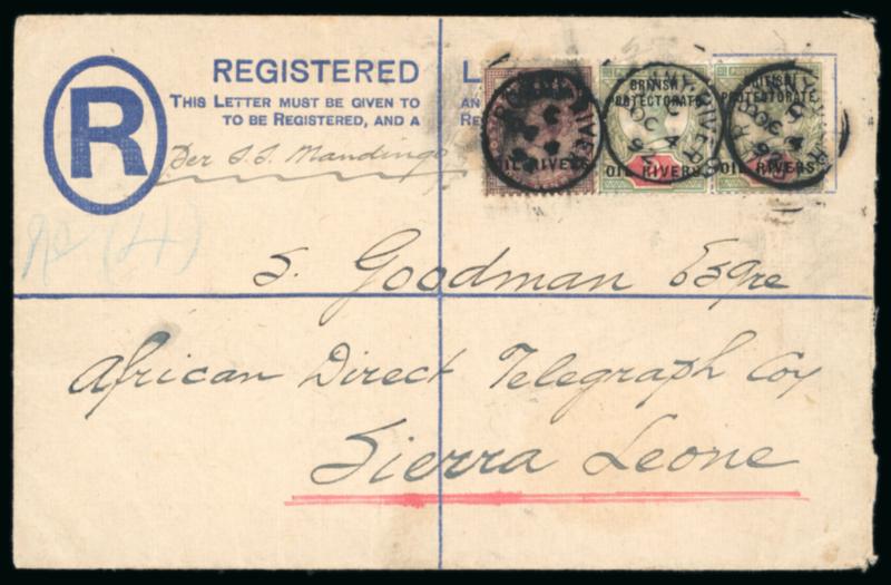 Bonny River: 1892 (Oct 4) 2d registered envelope (1892 July 2nd issue, size G, Gledhill type NR3 with die on backflap with Oil Rivers ovpt above and compensation table to £25 with thick lines), sent to the Africa Direct Telegraph Co. in Sierra Leone with 1892-94 1d and two 2d tied by Bonny River code "C" cds, endorsed "Per S.S. Mandringo", reverse with Freetown arrival, not only a scarce and early commercial usage of a registered envelope, this example is the only recorded use of type NR3, a postal stationery rarity. (Image)