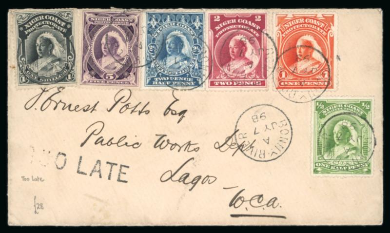 Bonny River: 1898 (Jul 7) envelope with 1894 set of six tied by Bonny River cds with scarce "TOO LATE" hs below, Lagos arrival bs, fine. (Image)