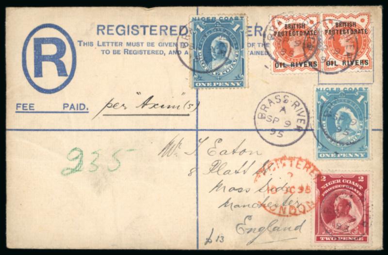 Brass: 1895 (Sep 9) Registered envelope (size F, Gledhill type NR5) with 1892-94 1/2d pair, 1894 (Jan 1d) and 1894 (May) 1/2d tied by Brass River code A cds, endorsed "Per Axim", Manchester arrival bs; very fine. (Image)