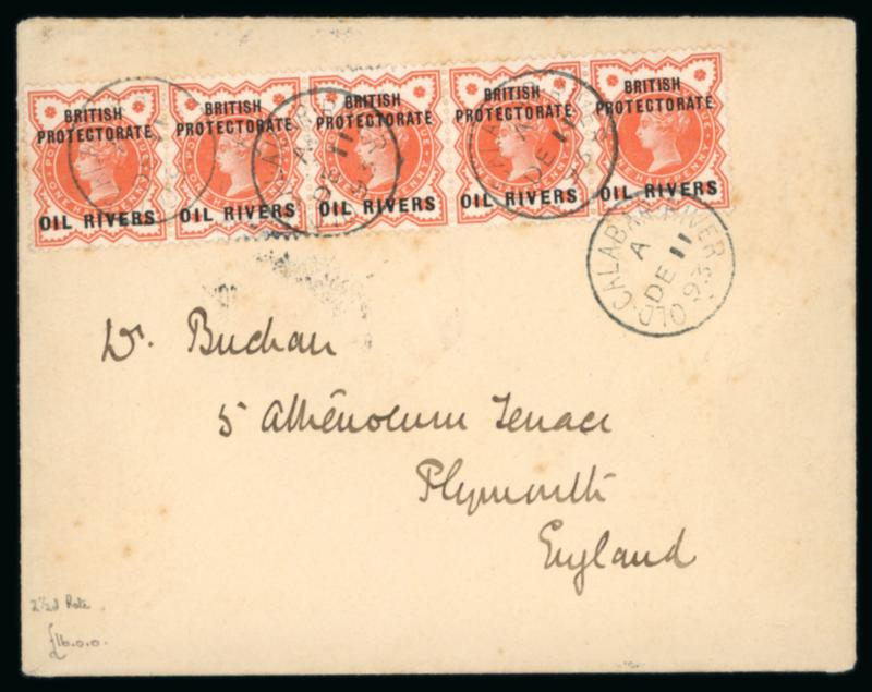 Old Calabar River: 1893 pair of envelopes, incl. 1893 (Dec 11) envelope to England with 1892-94 1/2d vermilion strip of five tied by Old Calabar River code A cds, paying the 2 1/2d rate, reverse with Plymouth arrival, some minor foxing, scarce multiple on cover; and 1893 (Oct 27) envelope to Scotland with 1892-94 2 1/2d tied by cds, sent to Fauldhouse and redirected to Edinburgh, minor toning otherwise fine. (Image)