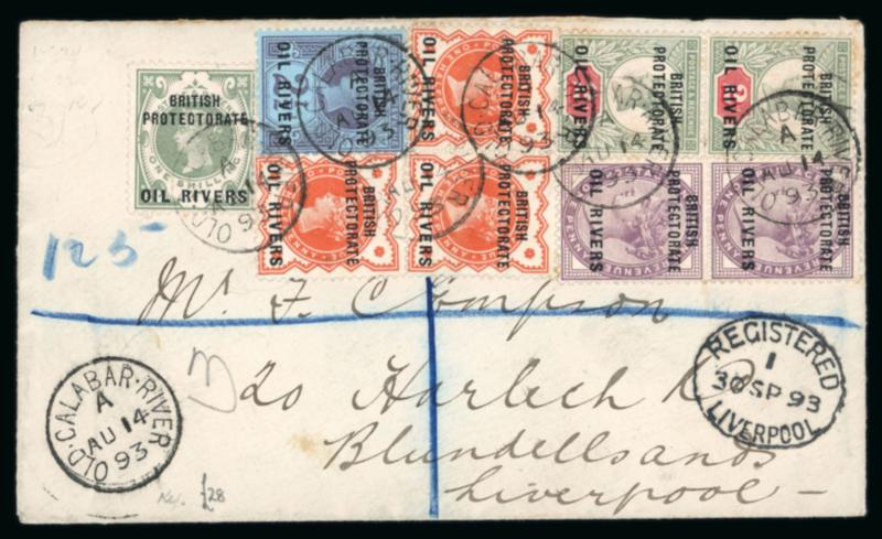 Old Calabar River: 1893 (Aug 14) envelope sent registered to England with 1892-94 1/2d (3), 1d vert. pair, 2d vert. pair, 2 1/2d and 1s tied by Old Calabr River code A cds, with Liverpool arrival below, attractive philatelic franking; ex Pilkington. (Image)