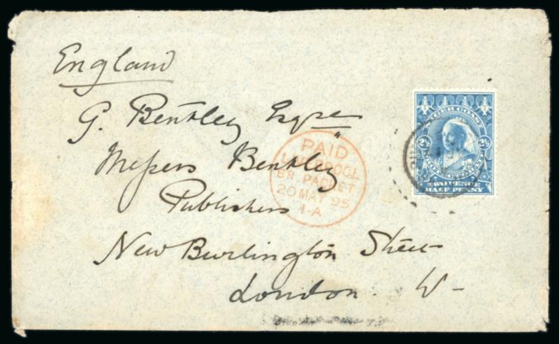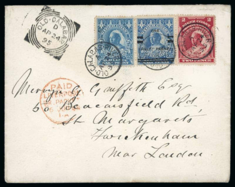 Old Calabar River: 1895 (Apr 24) envelope sent to England with the scarce 1894 1/2d on 2 1/2d along with 1894 2d and 2 1/2d tied by Old Calabar River cds, paying double the 2 1/2d rate, with squared circle ds and Liverpool transit adjacent, backflap with Niger Coast Protectorate coat of arms, Twickenham arrival, some adhesion along bottom on reverse from being stuck in a book, very fine (S.G. £250 for used single of S.G. 65). (Image)