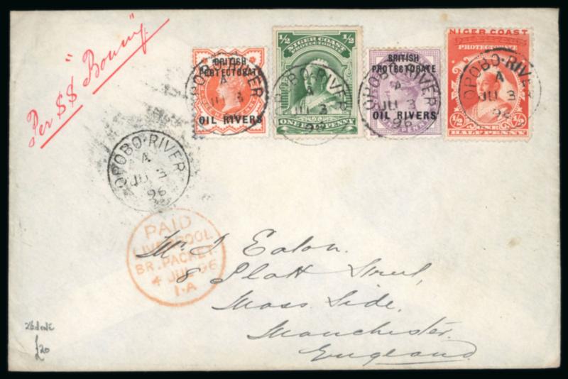 Opobo River: 1896 (Jun 3) envelope sent to England with 1892-94 1/2d and 1d, 1894 (Jan) 1/2d and 1894 (May) 1/2d each tied by Opobo River code A cds, Liverpool transit and Manchester arrival, paying the 2 1/2d rate, endorsed "Per SS Bonny", very fine. (Image)