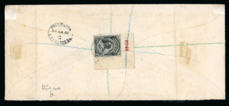 Registered: 1898 (May 16) OHMS envelope sent registered to England, franked on the reverse with 1897-98 1s black top right corner marginal with sheet number "0248", paying dour times the 2 1/2d rate plus 2d registration fee, tied by "REGISTERED" cds, with Liverpool transit and Birmingham arrival, some minor foxing, a scarce proper usage of the 1s. (Image)