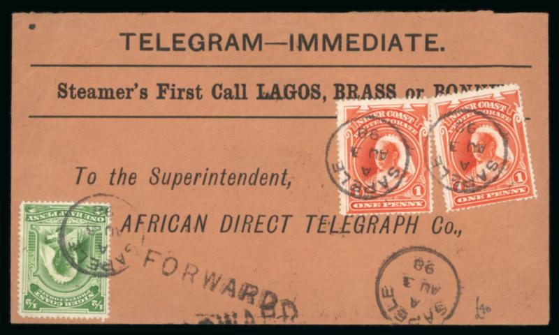 Sapele: 1898 (Aug 3) Printed telegram envelope sent to the African Direct Telegraph Co. with 1897-98 1/2d and two 1d tied by Sapele "A" cds, with "FROWARD" hs below (struck twice), reverse with commercial cachet, Warri AU 5 ds and Lagos AU 11 arrival, portion of backflap missing, an attractive and scarce cable letter cover.