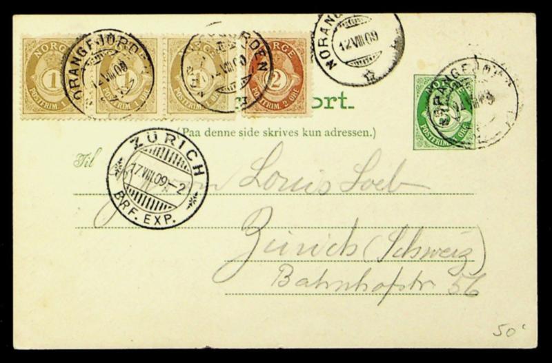 Norway 1909 4v uprated postcard from Jornfjorden to Zurich Switzerland (Image)