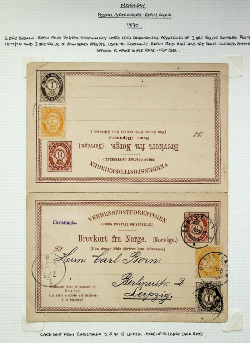 Norway 1890 1o+3o on 6o UPU card Christiania to Leipzig Germany+ reply (Image)