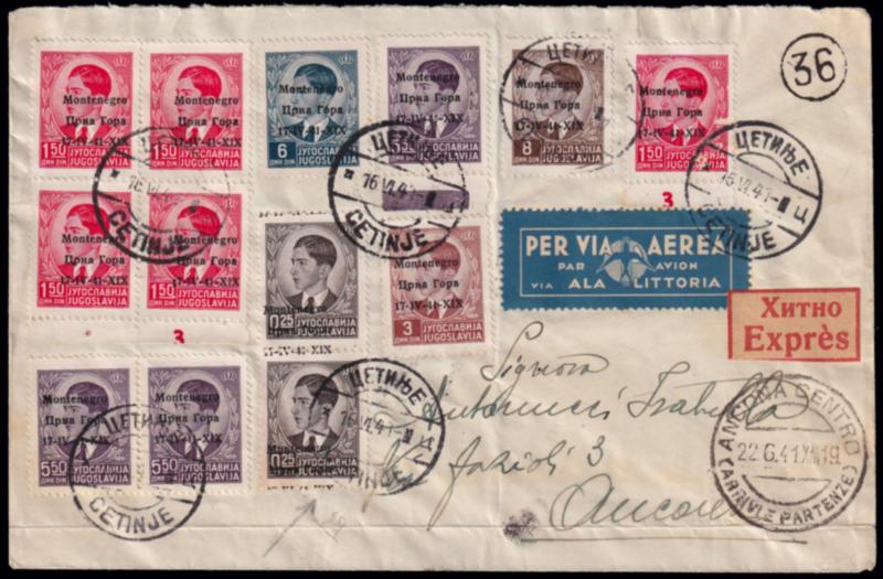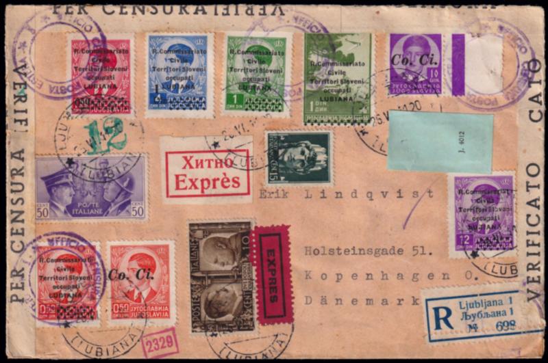 DESTINAZIONE DANIMARCA. Busta raccomandata espresso via aerea spedita il 25/6/41 da Lubiana per Kopenhagen ed affrancata con combinazione mista di francobolli soprastampati "R. Commissariato" e "Co. Ci." oltre ad alcuni valori non soprastampati del Regno d'Italia. Fascette e timbri di censura e bollo di arrivo. (Image)