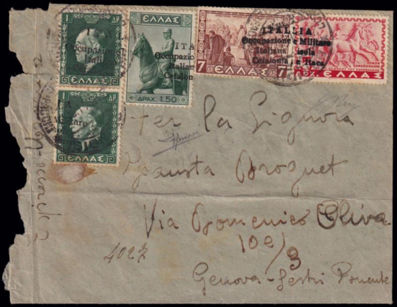 EMISSIONI DI ARGOSTOLI E ITACA. Lettera espresso diretta a Sestri Ponente affrancata per comolessivi 15,5 dracme con le due sezioni separate del raro francobollo da 1 dracma verde con soprastampa a macchina di Argostoli (Sassone n.8) e 3 francobolli con soprastampa a mano di Itaca da 5 e 7 dracme serie Mitologica e un francobollo Mon Equestre da 1,50 dracme (Sassone 63+65+71) tutti annullati con il bollo di transito "Brindisi Corrispondenze e Pacchi 29/8/1941". Al retro timbro di transito di Genova espressi e arrivo a destino. Dettagliato certificato di garanzia Sorani (1994) e grande firma G.Oliva. Rarissima corrispondenza non filatelica che presenta combinazione mista Argostoli e Itaca, inoltrata per espresso (la tariffa espresso corrispondeva a 10 dracme e la tariffa ordinaria a 8 dracme ma quasi tutte le corrispondenze viaggiate non avevano una corretta affrancazione). (Image)