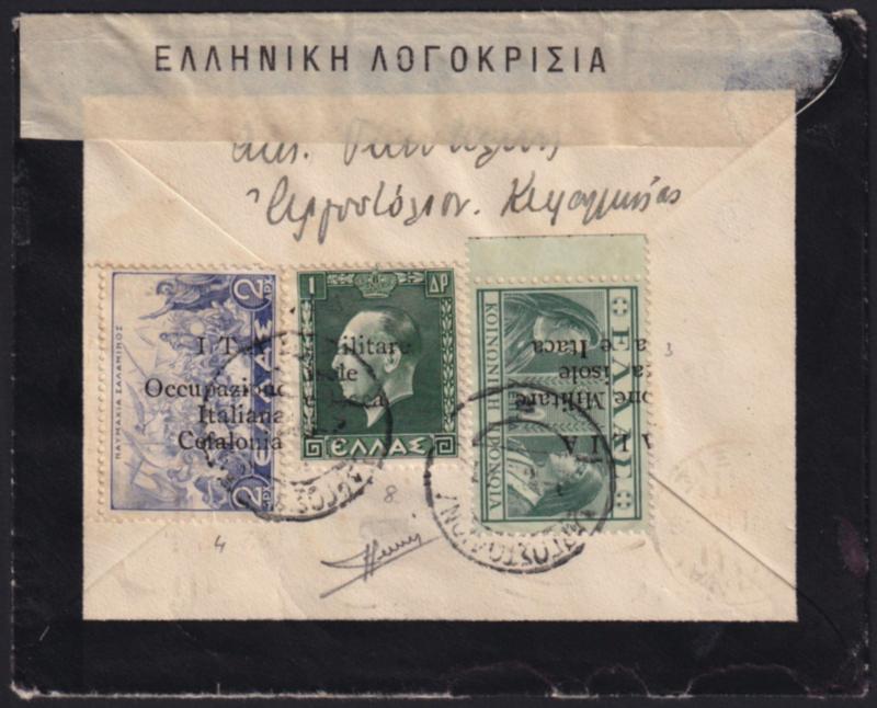 EMISSIONE DI ARGOSTOLI. Lettera spedita da Argostoli il 2/7/1941 affrancata in perfetta tariffa per l'interno della Grecia 3 dracme con due francobolli soprastampati "ITALIA Occupazione Militare Italiana isole Cefalonia e Itaca" a macchina da 1d. e da 2d. unitamente a francobollo da 50 lepta per Previdenza Sociale obbligatorio per le corrispondenze interne (Sassone nn.8+17+30), annullati col guller postale e timbro di arrivo a lato e fascetta di censura. Dettagliato certificato Sorani (1996). Una delle pochissime corrispondenze non filateliche in tariffa con i francobolli soprastampati. (Image)