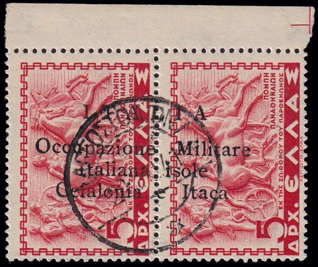 EMISSIONE DI ARGOSTOLI. Soprastampa a mano "ITALIA Occupazione Militare Italiana isola Cefalonia e Itaca" su coppia orizzontale del francobollo Mon. Equestre da 30d (n.72), annullato. Firma di garanzia G. Oliva. (Image)