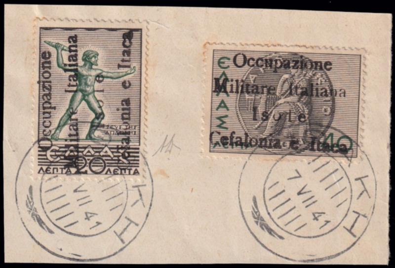 EMISSIONE DI ITACA. Mitologica, grande brano di lettera affrancato con 2 francobolli con soprastampa a mano "Occupazione Militare Italiana Isole Cefalonia e Itaca" rispettivamente da 20l. e 40l. (nn.30+31) annullati in data 7/7/41. Firma di garanzia A. Diena. Raro. (Image)