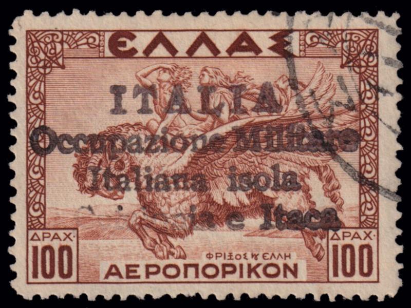 EMISSIONE DI ARGOSTOLI. L'alto valore da 100d. di posta aerea (n.PA23) con soprastampa a mano che presenta solamente le ultime due lettere (ia) della parola Cefalonia che quindi è quasi del tutto mancante, annullato. Firme di garanzia Raybaudi. A,Diena e R. Mondolfo. Varietà NON CATALOGATA. Due soli 100d. esistenti, a noi noti, con tali caratteristiche. (Image)
