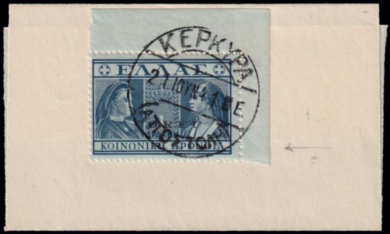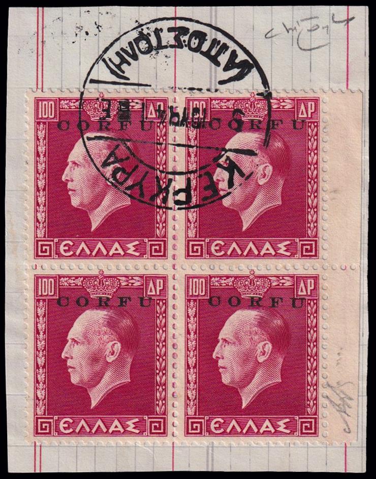 1941 EFFIGIE DI GIORGIO II. La serie di 4 valori soprastampati CORFU' in blocchi di 4, annullati su frammento (nn.15/18). Certificato Raybaudi (2000). Rari multipli. (Image)