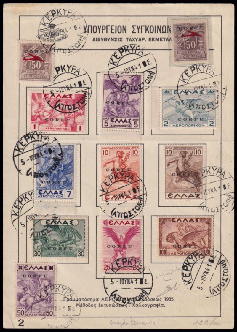 1941 POSTA AEREA. Cartoncino ufficiale delle poste con la serie di 11 francobolli soprastampati CORFU' annullati in data 5/6/1941 ed il 50l bruno nuovo. Firme di garanzia Raybaudi, A. Zanaria e certificato Scolari. (Image)