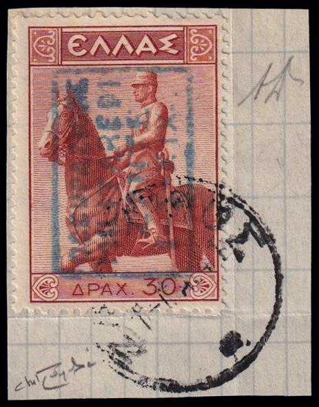 1941 MONUMENTO EQUESTRE. Il rarissimo francobollo da 30d. (n.19) con soprastampa azzurra solitamente impressa sui segnatasse, annullato su frammento completo. Firma di garanzia A. Diena e dettagliato certificato "oro" Raybaudi (2000). Insieme probabilmente unico. (Image)