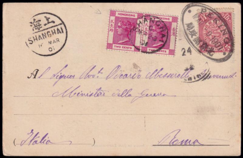 GUERRA DEI BOXER. Cartolina spedita da Pechino via Shanghai per Roma il 9/3/1901 con affrancatura mista Hong Kong 2c. (coppia) e 5c. Dragone. Timbro di arrivo in data 24... (Image)