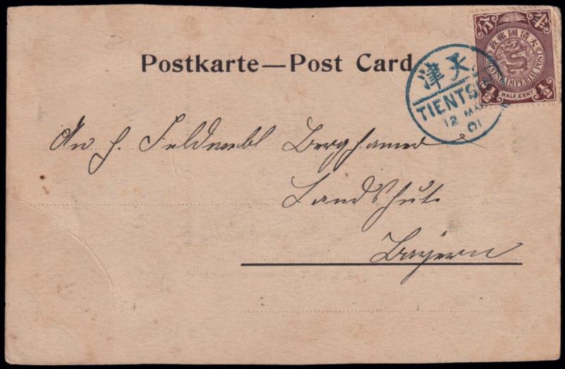 GUERRA DEI BOXER. Cartolina spedita da Tientsin il 12/3/1901 per la Germania affrancata con 1/2 cent. Dragone. (Image)