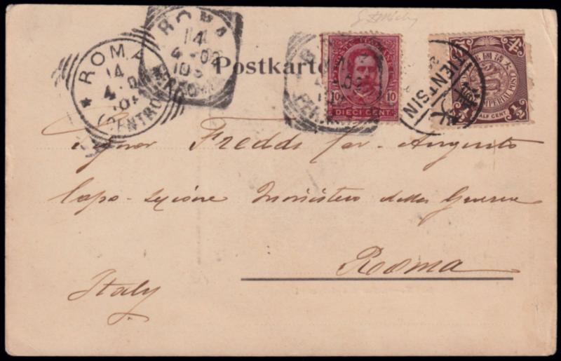 1902 TIENTSIN. Cartolina spedita in data 24/2/1902 per Roma affrancata con francobollo di Cina da 1/2 cent. e riaffrancata in arrivo a Roma con francobollo di Umberto I centesimi 10 annullato in data 14/4/1902. (Image)