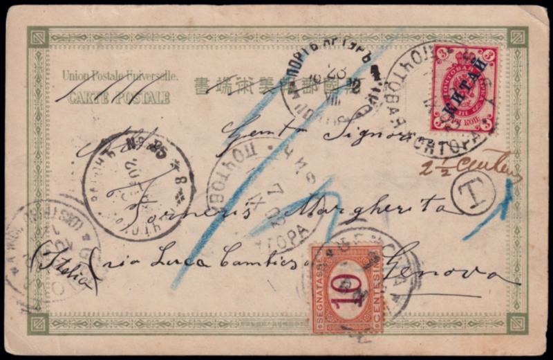 UFFICI POSTALI RUSSI IN CINA. Cartolina postale affrancata con francobollo soprastampato da 3 k. annullato "Chefoo 7/9/1902" e tassata 2 1/2 centesimi, diretta a Genova e li tassata con segnatasse da 10 centesimi. Timbro "Port Artur 4" e timbro ferroviario N° 25. (Image)