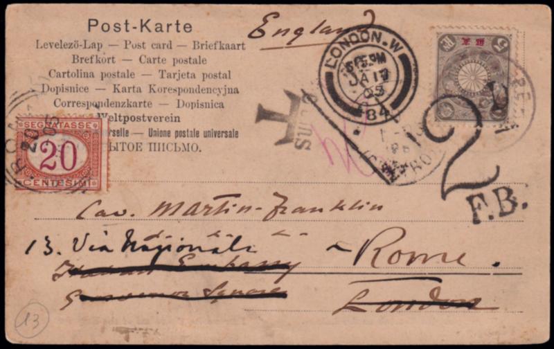 OCCUPAZIONE GIAPPONESE IN CINA. Cartolina di Pechino affrancata con francobollo giapponese da 5r. annullato col timbro "Peking.17/1/1905". Diretta a Londra e rispedita a Roma dove venne tassata con segnatasse da 20 centesimi. (Image)