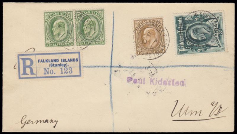 1904/12 KING GEORGE V. Registered cover to Germany via London Ju 4 1914 with multiple franking including the 3 sh green (SG 43+55+56). Arrival datestamp on reverse. (Image)