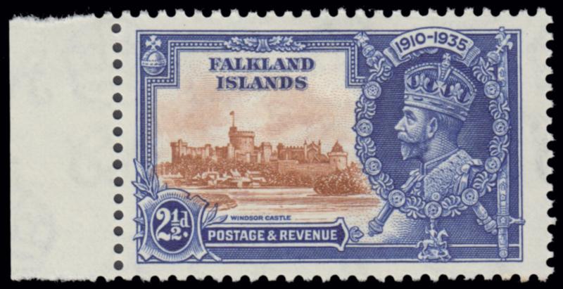 1935 SILVER JUBILEE VARIETY. 2 1/2 d. brown & deep blue FLAGSTAFF ON RIGHT HAND TURRET (SG 140d), unused with original gum, mounted. (Image)