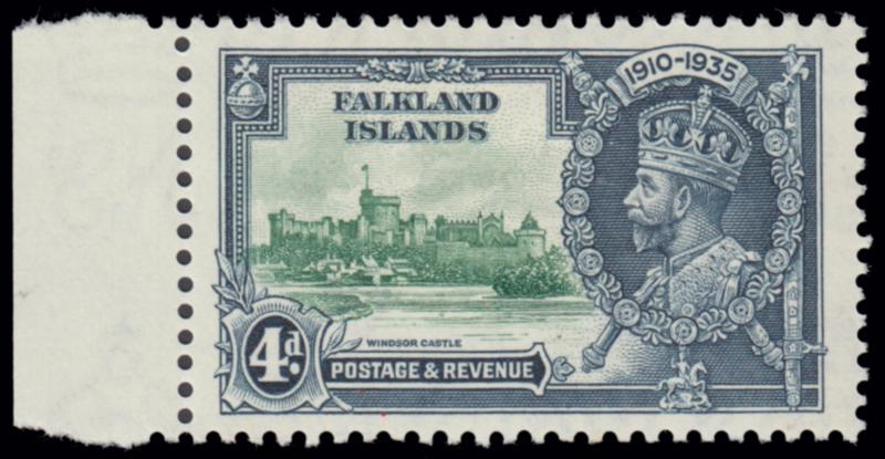 1935 SILVER JUBILEE VARIETY. 4d. green & indingo FLAGSTAFF ON RIGHT HAND TURRET (SG 141d), unused with original gum, mounted. Very fine and scarce. (Image)