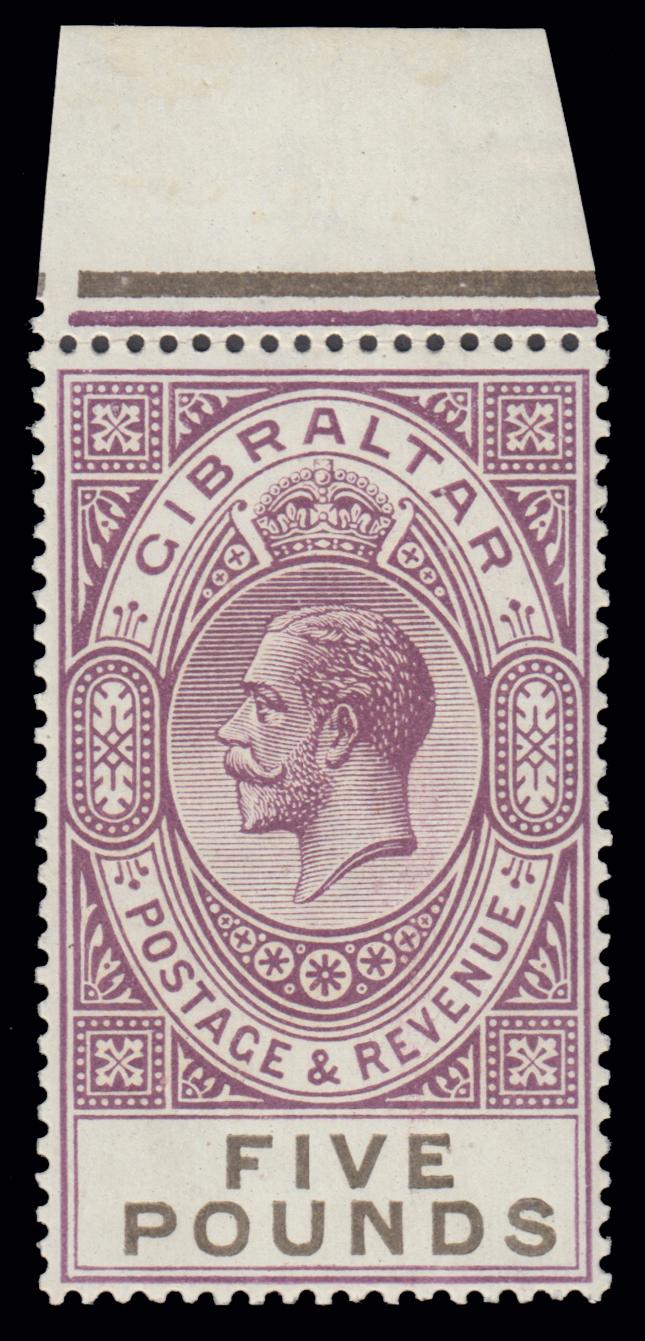 1925/32 KING GEORGE V. £5 violet & black top marginal, unused vivid colour, neatly centred, with original gum, unmounted. Very fine. (Image)