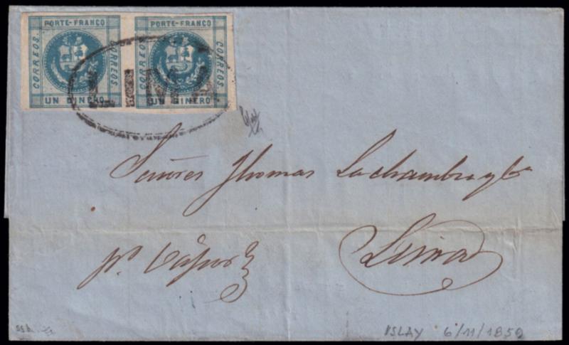 1858 COAT OF ARMS - LARGE LETTERS. Lettersheet dateline Islay Nov. 6 1859 bearing a horizontal pair of the 1 d. pale blue (S.G. 6) cancelled by large double oval "LIMA", sent by steamer to Lima. Cert. Holcombe, (Image)