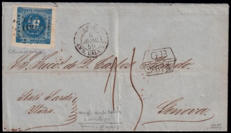1858 COAT OF ARMS - SMALL LETTERS. Letter from Lima to Genova dated 27 FEB. 1859 franked with large margined 1 dinero blue (S.G. 3) and shipped via London - Paris- Genova. Transit postmarks and on the front charged "15" decimes due in manuscript and the framed "GB/2f87" accourtancy marking applied in London. Signed G. Bolaffi and A.Bolaffi. (Image)