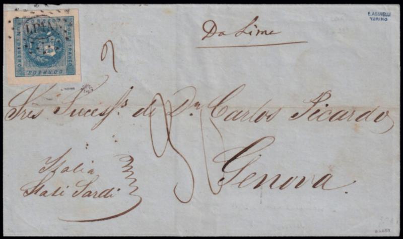 1858 COAT OF ARMS - SMALL LETTERS. Double rate letter from Lima to Genova dated 27 april 1858 prepaid with the 1 dinero light blu (S.G. 3). Cover shipped with the Pacific Steam Navigation and after crossing the Panama's isthmus carried on board of the Royal Mail Steam Packet Co. and arrived in Southampton was carried trough France in accordance with the Anglo-sardinian Convention (confirmed by the absence of French transit marking. 30 decimi charged on delivery. Arrival datestamp on the reverse. (Image)