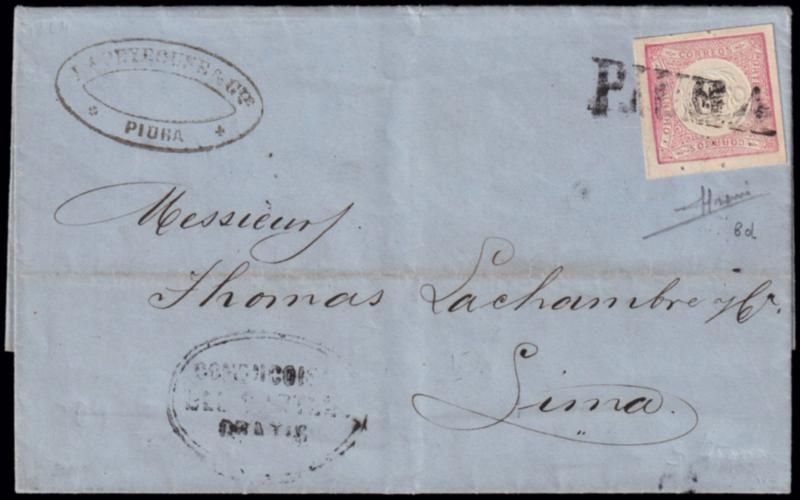 1862/63 LECOQ FIRST ISSUE. 1 d. vermilion (S.G. 12) a fine example used on 1864 (April 17) cover from Piura to Lima tied by linear handstamp PIURA. Arrival datestamp on reverse. Signed Sorani. (Image)