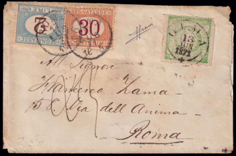 1868/72 LECOQ SECOND ISSUE. 1 d. yellow green used on cover to Roma tied by cds "Lima 13 JUN 1871". London - Verona transit datestamp on reverse and 2 lire and 30 cent. Postage Due on the front tied by Roma datestamp. Cert. Sorani. (Image)