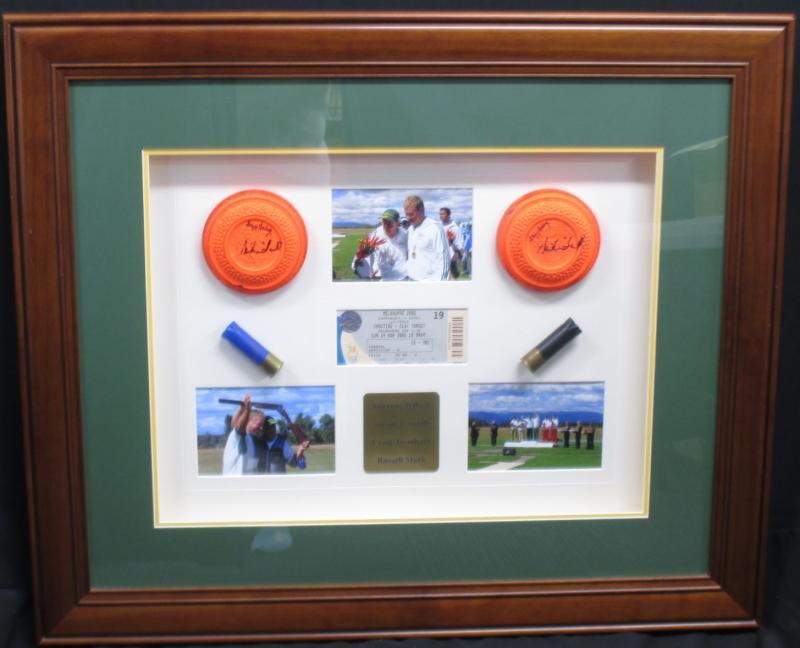 2006 Melbourne Commonwealth Games Shooting display including two clay targets signed by Suzanne Balogh, Susan Trindall, Craig Trembath & Russell Mark, window mounted, framed & glazed, overall 80x67cm. (Image1)