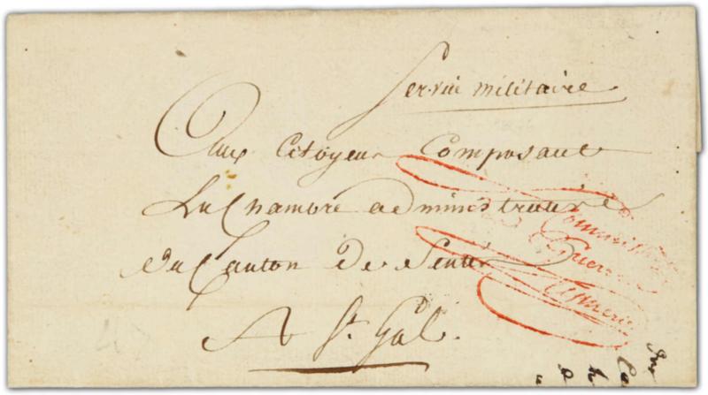 1800, Faltbriefhülle des französischen Militärs mit Portofreiheitsstempel "Le Commissaire des Guerre/Ulmeric", rückseitig ähnlicher Stempel als Briefsiegel, aus Konstanz (gemäß handschriftl. Angabe) (Image)
