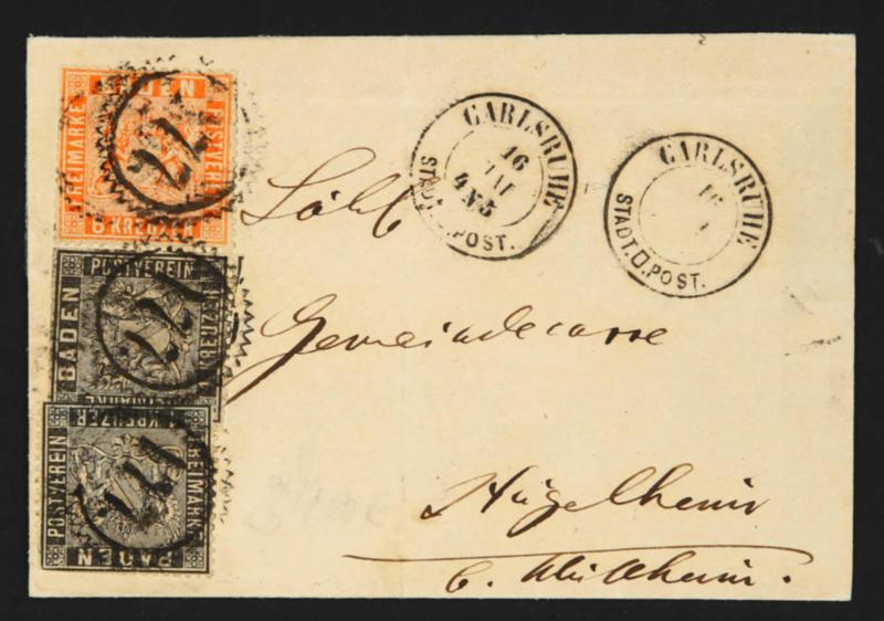 1860, 1 Kr. Wappen schwarz, 2 Einzelwerte zusammen mit 6 Kr. Wappen hellgelblichrot auf Faltbriefhülle, aufgegeben in "CARLSRUHE 16. MAI (60) STADT POST", entwertet mit Zackenkranzstp. "177", adressiert nach Hügelheim bei Müllheim, rückseitig mit Ankunftsstp., die Frankatur ist farbfrisch, alle 3 Werte mit Scherentrennung und teils fehlender oder flacher Zähnung, sonst gute Qualität (Image)