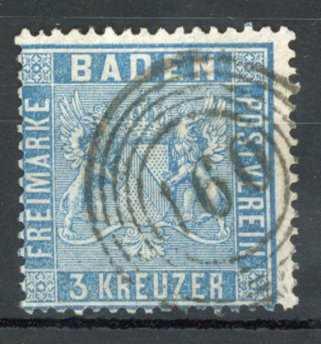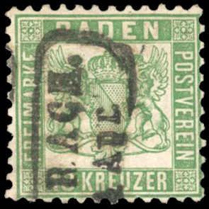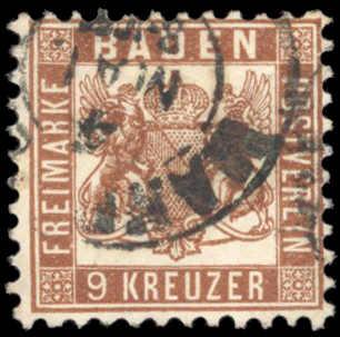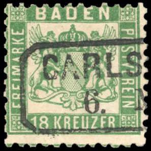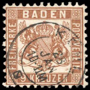 1862, 30 Kr. Wappen dunkelgelblichorange, Dkr. "KEHL 22. MAI 7-8 N.)", bis auf eine verkürzte Zahnspitze gut gezähnt, farbfrisch und sonst einwandfrei, ein schönes Exemplar dieser seltenen Marke, geprüft Engel BPP (ME 3.000,-) (Image)