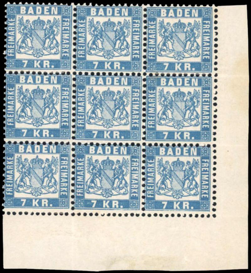 1868, 7 Kr. Wappen (Hintergrund weiß) lebhaftblau, ungebr./ postfr. 9er-Block aus der unteren rechten Bogenecke, farbfrisch und gut gezähnt, die 4 Marken in den Ecken je mit Falz oder Falzspur, die Einheit ist in der waager. Zähnung vorgefaltet, sonst gute Qualität, eine seltene Einheit aus dem Bestand des Prüfers Richter, im Michel nicht gelistet (Image)