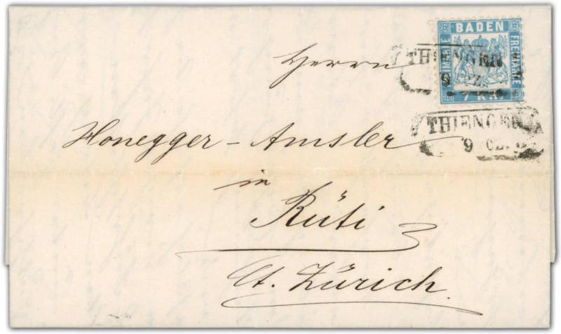 1871, 7 Kr. Wappen mit weißem Hintergrund hell- bis mittelgraublau auf Faltbrief nach Rüti/Schweiz, Ra2 "THIENGEN 9. Dez.", rückseitig Ankunftsstempel vom 10.12., farbfrisch und einwandfrei, seltene Einzelfrankatur, Fotoattest Stegmüller BPP 08/2024 (Image)